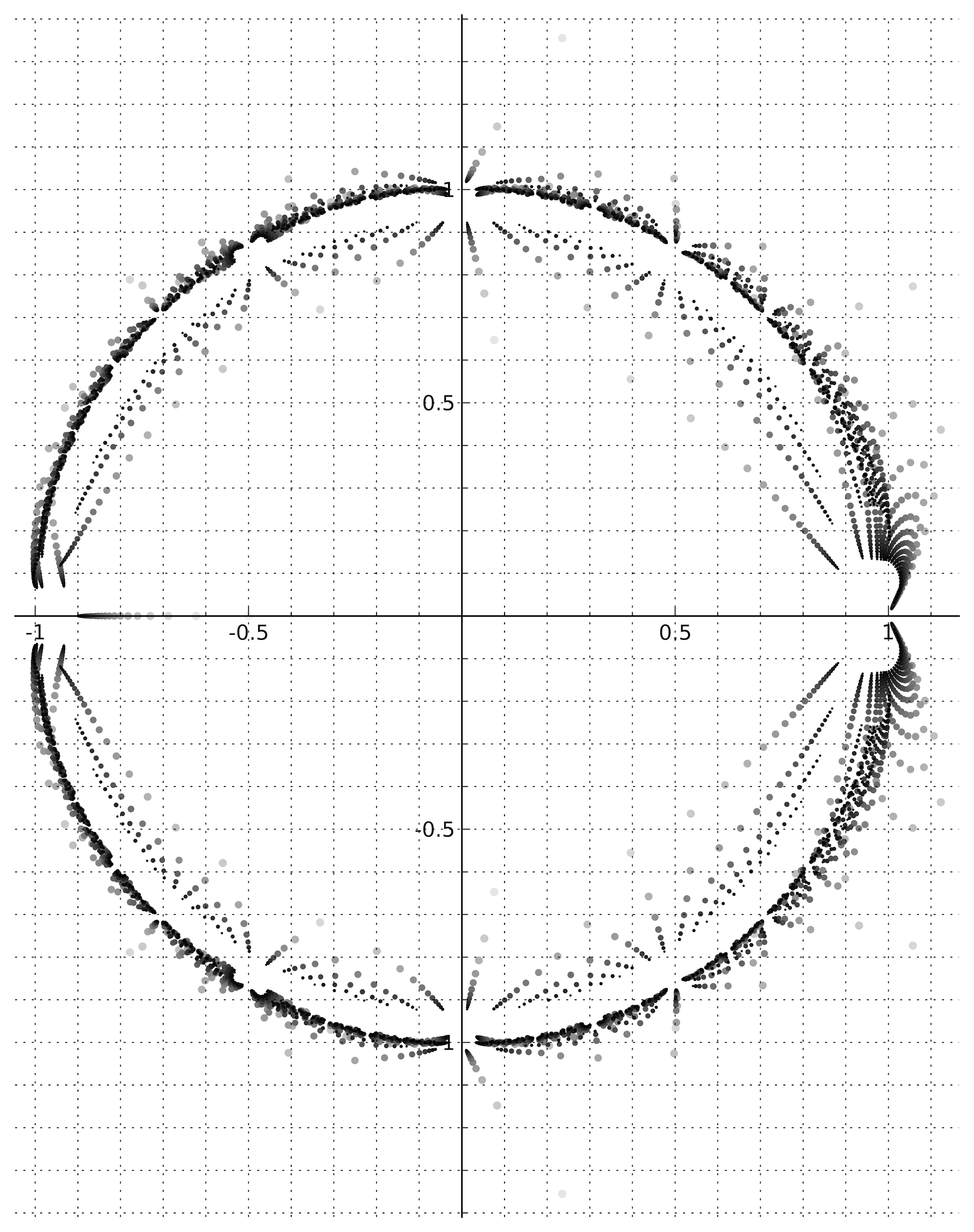 The plots below show the roots of the polynomial $P_n(z)$ for $n$ even on the left and